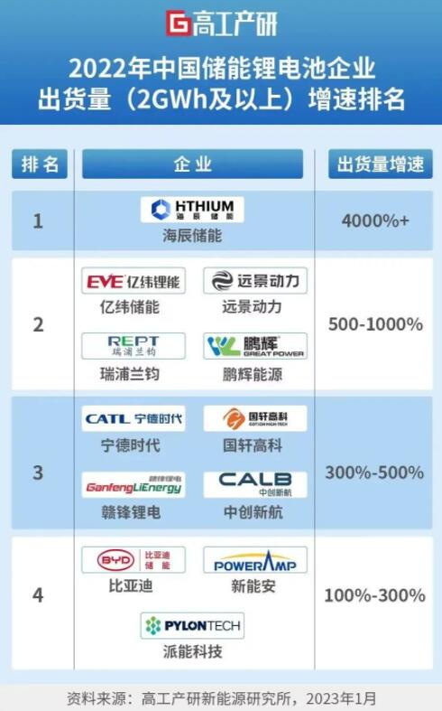 而從出貨量增速來(lái)看,2022年增速排名第一的為海辰儲(chǔ)能,達(dá)40倍以上。億緯鋰能、遠(yuǎn)景動(dòng)力、瑞浦蘭鈞、鵬輝能源排名第二檔,增速在5倍-10倍之間。寧德時(shí)代、國(guó)軒高科、贛鋒鋰電、中創(chuàng)新航位列第三檔,增速達(dá)3倍-5倍。比亞迪、派能科技、新能安出貨量增速達(dá)1倍-3倍。