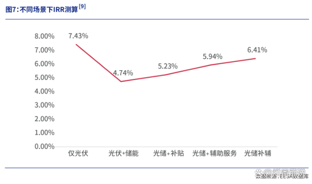 以內(nèi)蒙古某100MW光伏發(fā)電項目、配套20MW/40MWh儲能電站為例,在僅光伏發(fā)電的情景下,內(nèi)部收益率高達7.43%,光伏+儲能的情景下,內(nèi)部收益率降至4.74%,而如果是光伏+儲能+補貼的情景下,內(nèi)部收益率可達5.23%;“光伏+儲能+輔助服務(wù)”內(nèi)部收益率可達5.94%;“光伏+儲能+補貼+輔助服務(wù)”,內(nèi)部收益率更是高至6.41%。