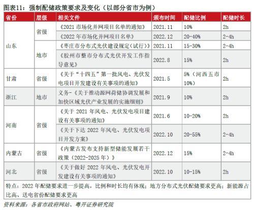 強(qiáng)制配儲政策客觀上拉動儲能裝機(jī)需求。2021年2月,國家發(fā)改委、能源局出臺《關(guān)于推進(jìn)電力源網(wǎng)荷儲一體化和多能互補(bǔ)發(fā)展的指導(dǎo)意見》,明確增量風(fēng)光儲一體化要優(yōu)化配套儲能規(guī)模,充分發(fā)揮儲能調(diào)峰、調(diào)頻作用。5月出臺的《關(guān)于2021年風(fēng)電、光伏發(fā)電開發(fā)建設(shè)有關(guān)事項的通知》也指出保障性并網(wǎng)以外的項目,需通過自建、合建共享或購買服務(wù)等市場化方式落實(shí)并網(wǎng)條件后并網(wǎng)。自此,多地相繼發(fā)布電源側(cè)風(fēng)光強(qiáng)制配儲政策,多要求10%/2h的配置比例和時長,并且政策要求逐漸向15-30%和4-5h的高比例、長時儲能發(fā)展。事實(shí)上,多地風(fēng)光項目招標(biāo)競爭過程中,實(shí)際配儲情況高于政策要求。
