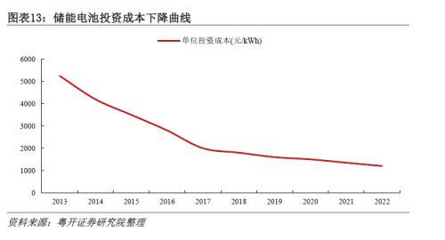 在持續(xù)技術(shù)研發(fā)投入和規(guī)模效應(yīng)下,儲能成本快速下降。以鋰電池儲能為例,得益于新能源汽車和儲能行業(yè)共同發(fā)展,鋰電池儲能成本以年均15%的速度下降,2013年鋰電儲能建設(shè)成本約為4.5-6.0元/Wh,2017年成本降至1.6-2.0元/Wh,近兩年受上游鋰價上漲影響,鋰電儲能成本降幅放緩,2023年上半年鋰電儲能成本約為1.24-1.61元/Wh。