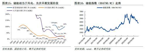 通過裝機(jī)增長率看儲能行業(yè)所處發(fā)展位置,當(dāng)前儲能裝機(jī)兩年復(fù)合增長率在100%上下,相當(dāng)于風(fēng)電、光伏行業(yè)發(fā)展早期。