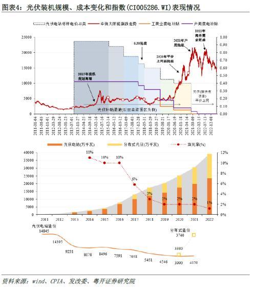 3、具體來看:1)風(fēng)電呈現(xiàn)周期性行情:三上漲與兩回調(diào)交錯,對應(yīng)行業(yè)擴(kuò)張與嚴(yán)監(jiān)管交替。風(fēng)電周期性行情與行業(yè)供需均衡情況相匹配,行業(yè)快速擴(kuò)張或增速放緩背后的原因在于政策引導(dǎo)或限制需求,復(fù)盤風(fēng)電發(fā)展和指數(shù)表現(xiàn),我們發(fā)現(xiàn)風(fēng)電行情周期大約在5年左右,每2-3年進(jìn)行一次峰谷切換。2)光伏“四上一下”行情:規(guī)劃、補(bǔ)貼和需求是驅(qū)動因素。單復(fù)盤光伏指數(shù)走勢,光伏1-2年出現(xiàn)一波行情,但結(jié)合行業(yè)監(jiān)管和企業(yè)出清來看,光伏產(chǎn)業(yè)發(fā)展和行情周期仍為5年左右,期間受補(bǔ)貼退坡等事件驅(qū)動,指數(shù)出現(xiàn)階段性行情。