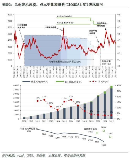 2008年底風(fēng)電指數(shù)底部回升,2010年底指數(shù)見頂,期間補(bǔ)貼政策發(fā)布;2011年后指數(shù)開啟下跌,于2012年末見底,期間風(fēng)電遭遇行業(yè)出清和嚴(yán)監(jiān)管;2013年指數(shù)緩慢反彈回升,2015年陸風(fēng)搶裝和市場大熱推動指數(shù)快速爬升,至2015年6月見頂;2015年下半年開始,指數(shù)震蕩下跌,并于2018年10月觸底反彈;2020和2021年連續(xù)兩年的搶裝使得風(fēng)電指數(shù)創(chuàng)新高,2021年11月指數(shù)見頂,雖在2022年有階段性行情表現(xiàn),但整體波動式下跌。