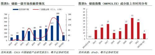 從儲能公司投融資角度來看,近兩年儲能一級和二級市場投融資熱度高漲。不完全統(tǒng)計數(shù)據(jù)顯示,截至2023年一季度,300余家儲能企業(yè)獲得融資,涉及投融資事件900余件、已披露融資金額近2000億元。其中,2021年儲能披露融資金額近600億元,2022年儲能行業(yè)全年融資189次。二級市場方面,近三年儲能相關(guān)公司IPO多達(dá)97家,占儲能指數(shù)(885921.TI)比重達(dá)24.8%,此外也有部分上市公司于近些年實(shí)現(xiàn)儲能業(yè)務(wù)的突破和轉(zhuǎn)型。