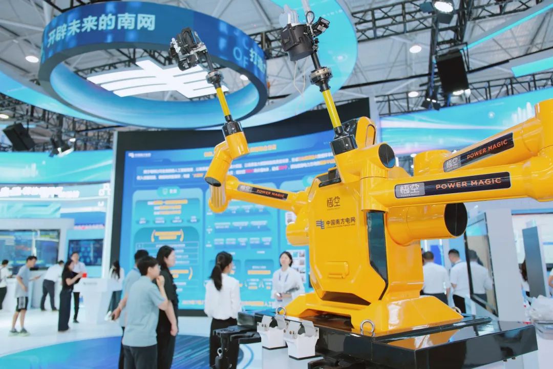 在數(shù)博會南網(wǎng)主展廳,“大瓦特”具身機(jī)器人和吠云組成的“機(jī)器人戰(zhàn)隊”亮相。(南網(wǎng)傳媒公司 供圖)
