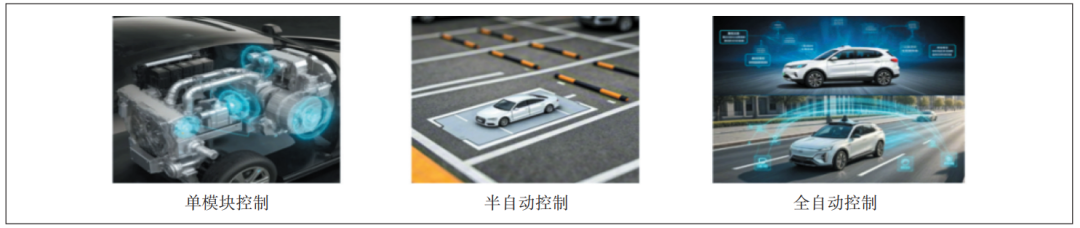 智能網(wǎng)聯(lián)汽車的技術(shù)演進歷程一般分為3個階段(見圖4)。第1階段是單模塊控制階段,車輛各個關(guān)鍵部件如動力系統(tǒng)、制動系統(tǒng)等都各自配備獨立的控制模塊,模塊之間協(xié)同性較差,只能實現(xiàn)基礎(chǔ)、相對簡單的功能,例如簡單的定速巡航,車輛無法自主應對復雜路況;第2階段是半自動控制階段,部分駕駛?cè)蝿湛梢杂绍囕v自動完成,例如記憶泊車功能,車輛能夠自動識別停車位并精準控制轉(zhuǎn)向、速度等完成泊車動作,但仍需要駕駛員參與;第3階段是全自動控制階段,車輛已達成真正意義上的高度智能化與自主化。車輛依托自身及周邊環(huán)境多傳感器融合技術(shù)構(gòu)建起全方位、高精度的環(huán)境感知體系,并基于云端智能網(wǎng)聯(lián)平臺的強大賦能,具備強大的駕駛決策能力,可實時調(diào)整行駛策略以應對復雜多變交通場景,全程無需駕駛員任何干預。