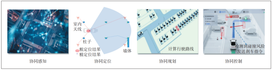 典型場景如智慧泊車,通過協(xié)同感知、協(xié)同定位、協(xié)同規(guī)劃和協(xié)同控制等技術(shù)實現(xiàn)高效、智能的停車管理和服務(見圖1)。智慧泊車的技術(shù)核心是根據(jù)多源傳感器異構(gòu)算法聯(lián)合感知的異步動態(tài)協(xié)同感知系統(tǒng),基于場側(cè)的無線通信技術(shù)和車輛即時定位與地圖構(gòu)建技術(shù)的協(xié)同定位系統(tǒng),同時基于先驗地圖和實時路況的全局路徑調(diào)度和車輛感知的局部軌跡規(guī)劃的協(xié)同系統(tǒng),以及場端原始感知數(shù)據(jù)及預測與車輛實時規(guī)劃軌跡的實時干涉控制系統(tǒng),實現(xiàn)車路云一體化的泊車服務。
