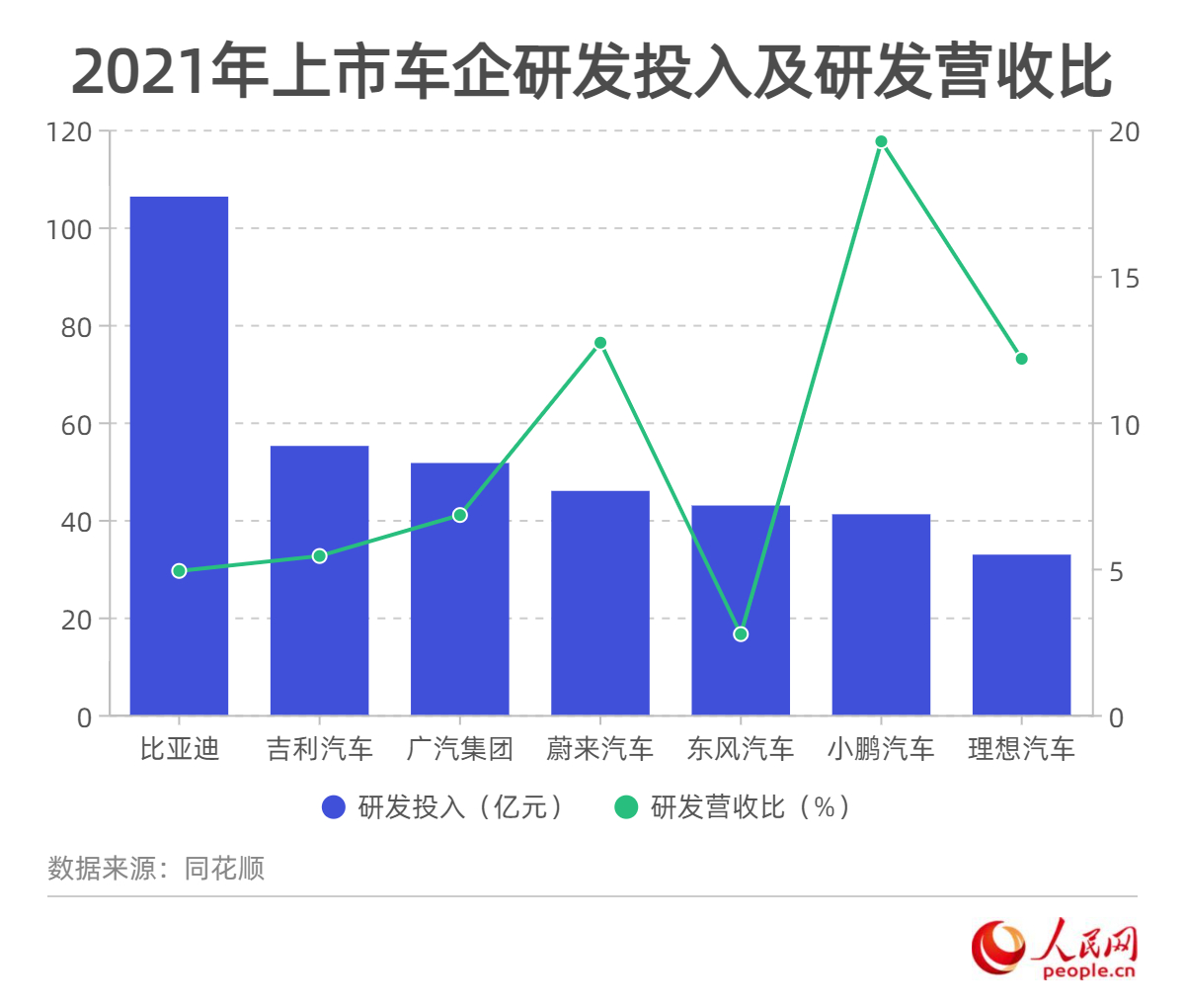 比亞迪披露,其研發(fā)投入項目主要包括刀片電池技術、儲能產品、超級混動、智能網聯(lián)系統(tǒng)等;蔚來、小鵬研發(fā)費用大幅增加主要是由于研發(fā)職能人員成本以及新車型、新技術開發(fā)等費用增加;廣汽集團全年累計的研發(fā)支出超過50億元,研發(fā)支出主要用于了加強自主研發(fā)和創(chuàng)新能力建設,并同步推進常規(guī)動力車型、新能源車型開發(fā)項目及核心部件開發(fā)。