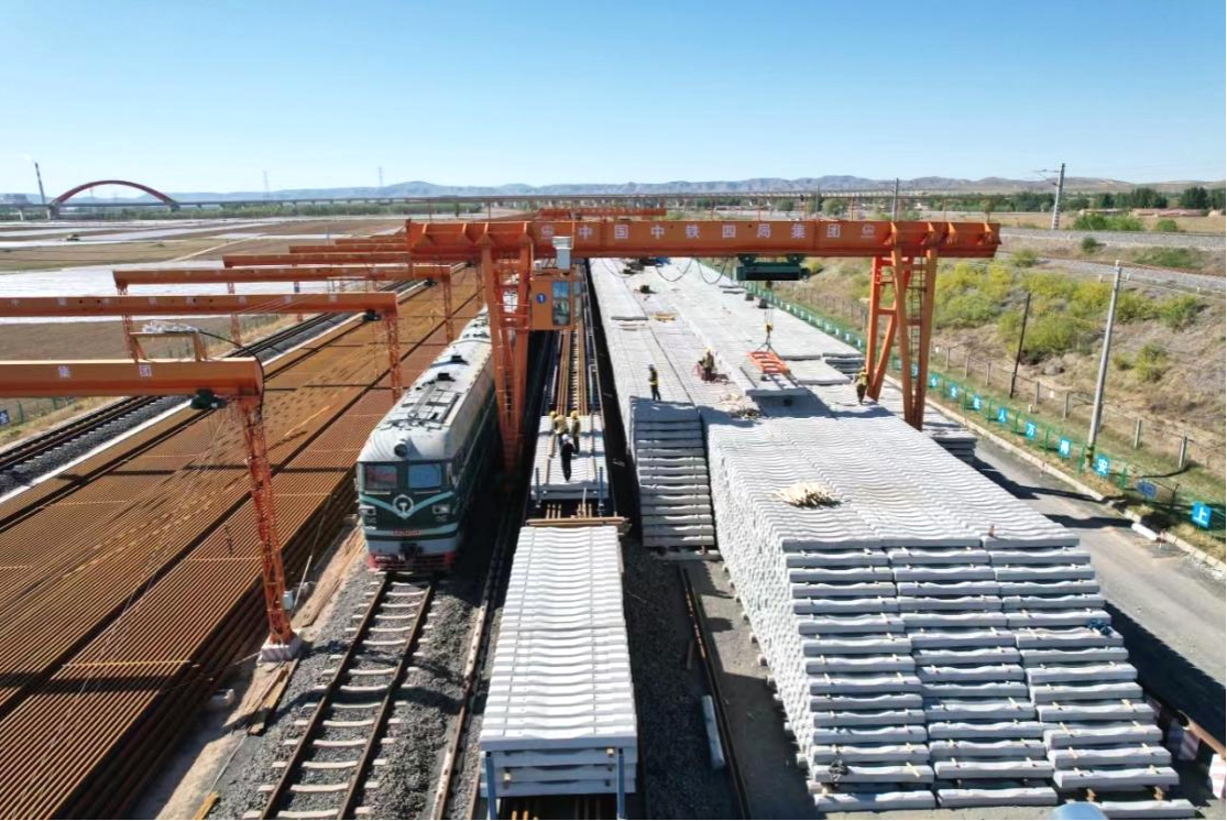 軌枕專列在大準(zhǔn)線丹洲營(yíng)鋪軌基地卸車