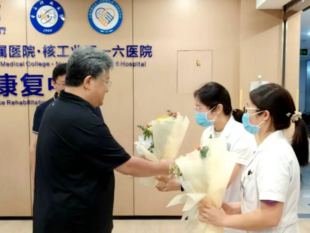 余劍鋒一行先后參觀了核工業(yè)四一六醫(yī)院放射科、康復(fù)科、骨科等重點科室,詢問了醫(yī)務(wù)人員工作生活情況,查看了相關(guān)設(shè)施設(shè)備,聽取了醫(yī)院核醫(yī)療綜合學(xué)科群和整體業(yè)務(wù)發(fā)展情況,肯定了醫(yī)院近幾年在承擔(dān)國家核應(yīng)急救援任務(wù)、抗擊新冠疫情、爭創(chuàng)醫(yī)學(xué)科研中心、保障中核人健康等方面作出積極貢獻(xiàn),是集團公司戰(zhàn)略部署落地落實的忠誠踐行者。中核集團副總經(jīng)濟師杜吉國,中國核動力研究設(shè)計院、核工業(yè)四一六醫(yī)院主要負(fù)責(zé)人陪同慰問。