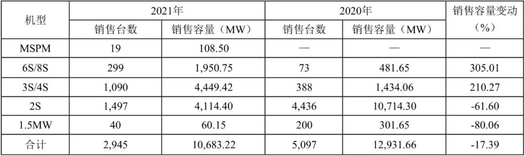 2021年,在金風科技實現(xiàn)對外銷售的10.68GW中,2S平臺機組銷售容量同比下降61.6%,占比降至38.5%;大功率和高毛利的6/8S平臺機組銷售容量同比提升305%,占比提升至18.3%。而且中速永磁產品也實現(xiàn)了首次銷售。