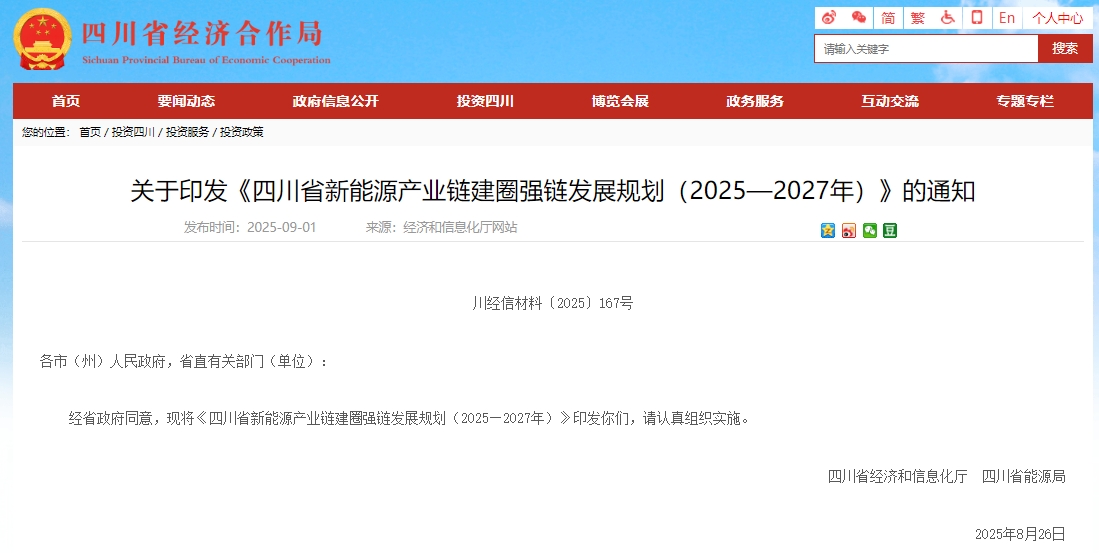近日,四川省經(jīng)濟(jì)和信息化廳聯(lián)合省能源局印發(fā)《四川省新能源產(chǎn)業(yè)鏈建圈強(qiáng)鏈發(fā)展規(guī)劃(2025—2027年)》(以下簡(jiǎn)稱《規(guī)劃》)?!兑?guī)劃》聚焦光伏、風(fēng)電、氫能、新型儲(chǔ)能等重點(diǎn)領(lǐng)域的產(chǎn)業(yè)發(fā)展綜合實(shí)力提升,提出到2027年,四川省新能源產(chǎn)業(yè)鏈營(yíng)業(yè)收入超過5000億元,力爭(zhēng)達(dá)到6000億元的發(fā)展目標(biāo)。