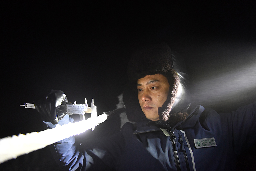 本輪寒潮期間,湖南省提前布置51套主網(wǎng)、142套配網(wǎng)融冰裝置,8300多名電力工人隨時待命,做好雨雪、冰凍、強風(fēng)等異常天氣下的設(shè)備特巡和特護,守護電網(wǎng)安全,守護萬家燈火。(新華社記者 陳振海 攝)