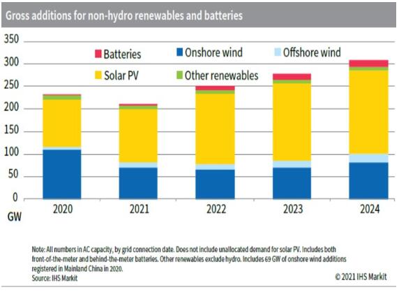 根據(jù)國際市場(chǎng)研究機(jī)構(gòu)IHS Markit的白皮書,全球每年可再生能源發(fā)電容量增量將從2020年的200吉瓦增加到2022年的約250吉瓦,然后到2024年增加到300吉瓦以上。