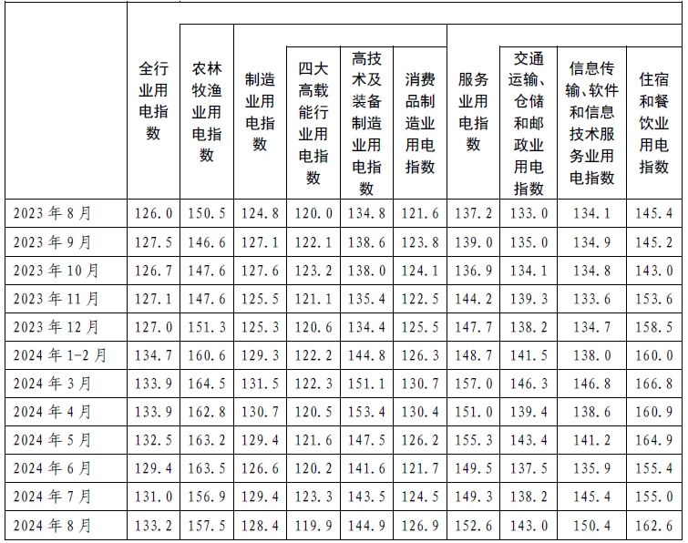 2024年8月,全行業(yè)用電指數(shù)為133.2,全行業(yè)用電量比2020年基期增長(zhǎng)了33.2%,年均增長(zhǎng)7.4%,同比增長(zhǎng)5.7%,全行業(yè)用電量保持平穩(wěn)增長(zhǎng)。
