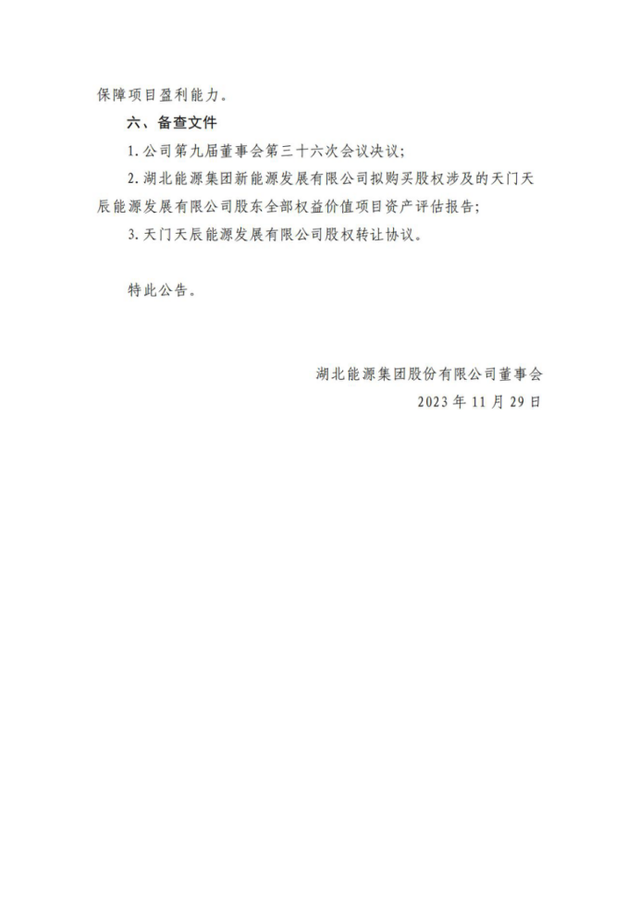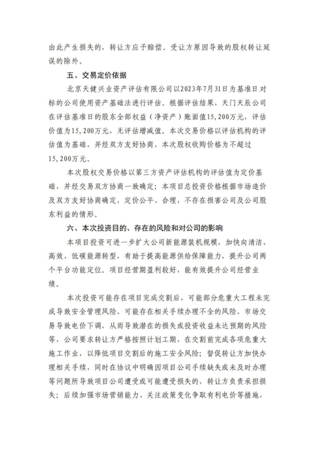 以股權(quán)對(duì)價(jià)不超過(guò)15,200萬(wàn)元收購(gòu)天門(mén)天辰能源發(fā)展有限公司100%股權(quán),承接其全部資產(chǎn)及經(jīng)審計(jì)確認(rèn)的負(fù)債,總投資不超過(guò)73,852萬(wàn)元。天門(mén)天辰公司為天門(mén)市天辰拖市100MW風(fēng)電場(chǎng)項(xiàng)目公司。