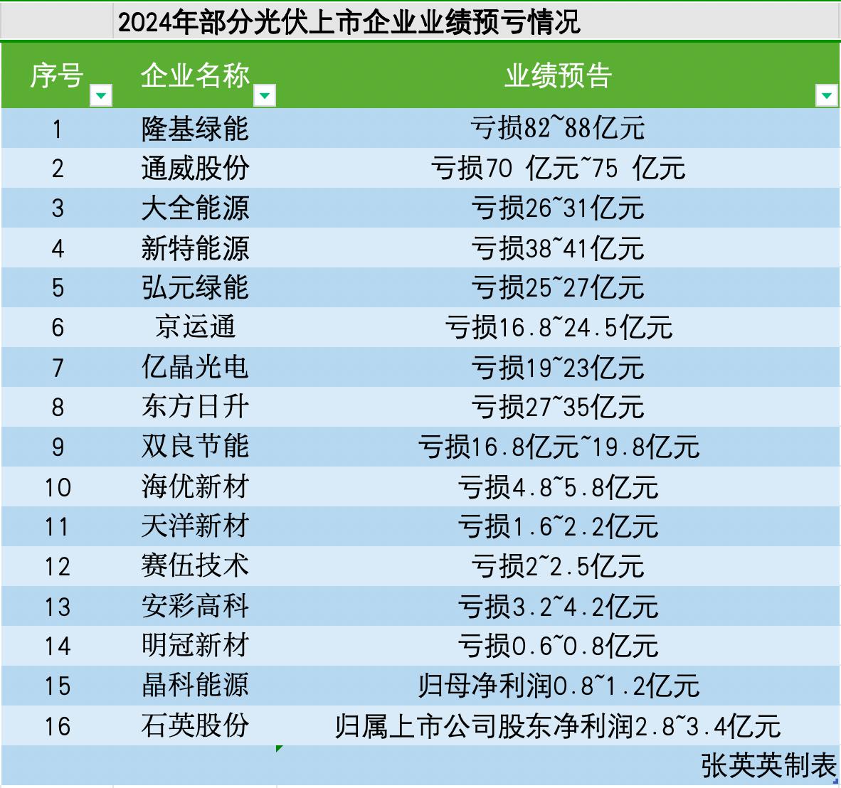 業(yè)績預告顯示,隆基綠能預計虧損82億到88億元,通威股份預計虧損70億至75億元,新特能源預計虧損38億至41億元,大全能源預計虧損26億至31億元,弘元綠能(603185.SH)預計虧損25億至27億元,東方日升預計虧損27億至35億元,億晶光電預計虧損19億至23億元,京運通(601908.SH)預計虧損16.8億至24.5億元,雙良節(jié)能(600481.SH)預計虧損16.8億至19.8億元。