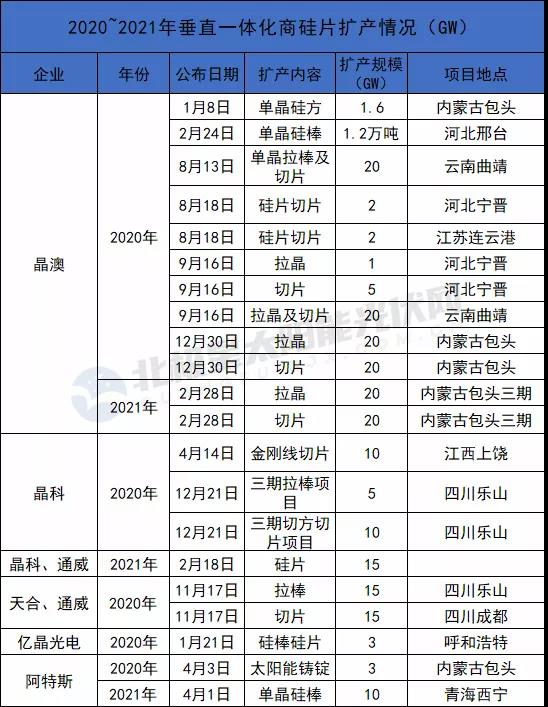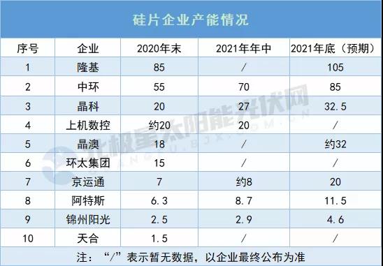 而2021年截至目前,隆基暫未公開硅片相關(guān)擴(kuò)產(chǎn)計劃,2020年其在云南新擴(kuò)70GW單晶產(chǎn)能。