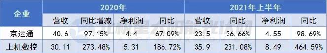 以鑄錠爐起家的京運(yùn)通從2017年開始主攻硅片業(yè)務(wù),截至2021年中,京運(yùn)通單晶硅片產(chǎn)能約8GW,另有12GW新增產(chǎn)能處于爬產(chǎn)期,預(yù)計2021年底產(chǎn)能達(dá)20GW;切割設(shè)備商上機(jī)數(shù)控從2019 年通過全資子公司弘元新材進(jìn)一步拓展單晶硅業(yè)務(wù),截至2021年中,實(shí)際產(chǎn)能20GW。2020年以及2021年上半年,京運(yùn)通、上機(jī)數(shù)控營收及凈利潤均實(shí)現(xiàn)了大幅增長,最高漲幅達(dá)464.59%,主要原因均指向硅片營收的大增。其中,上機(jī)數(shù)控2021年上半年營收及凈利潤均超過2020年全年。
