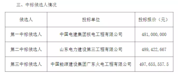 第一中標(biāo)候選人:中國電建集團(tuán)核電工程有限公司,投標(biāo)含稅總報(bào)價(jià)∶19762.307 萬元,折合3.85元/W。