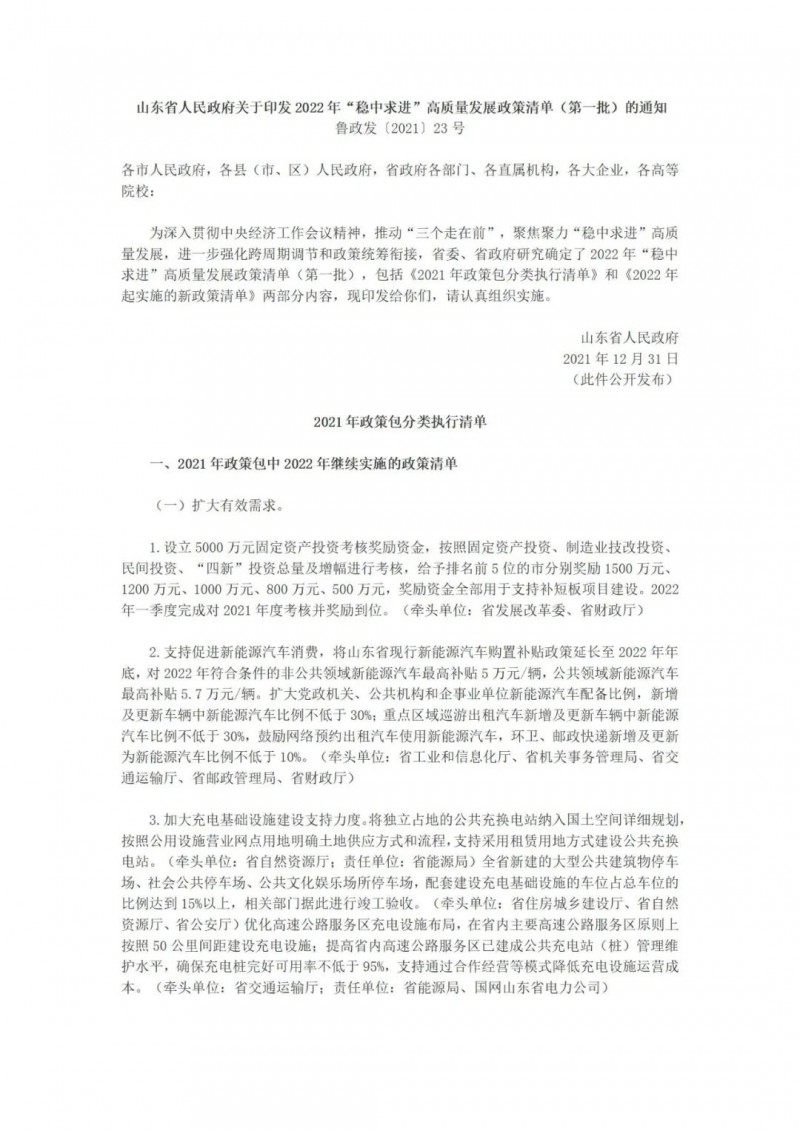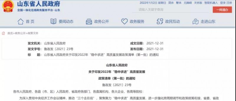 12月31日,山東省人民政府印發(fā)2022年“穩(wěn)中求進(jìn)”高質(zhì)量發(fā)展政策清單(第一批)的通知,提出了共178項(xiàng)優(yōu)惠政策。