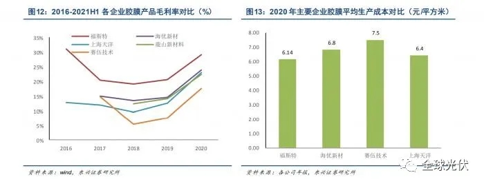 膠膜市場高度集中,主要企業(yè)有福斯特(116.700, 1.04, 0.90%)、海優(yōu)新材(220.200, -7.80, -3.42%)、斯威克和賽伍技術(shù)(26.720, -0.68, -2.48%)、上海天洋(17.170, 0.41, 2.45%)等。由于2021年年報未出,統(tǒng)計2020年研報得出,2020年TOP3企業(yè)份額超過90%,其中福斯特市占率超過60%,遠(yuǎn)超行業(yè)其他企業(yè),屬于該行業(yè)的唯一龍頭。