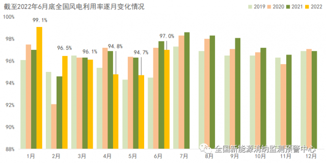 截至6月底全國風(fēng)電利用率逐月變化情況