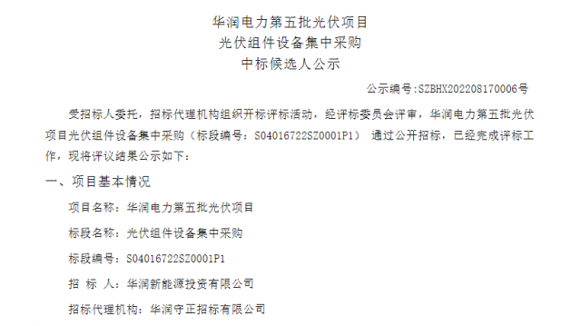 表:華潤(rùn)電力第五批光伏項(xiàng)目光伏組件設(shè)備集中采購(gòu)中標(biāo)候選人