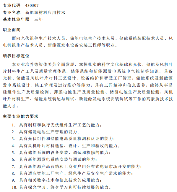 在中等職業(yè)教育中,包括光伏工程技術(shù)與應用專業(yè)、太陽能與沼氣技術(shù)利用兩個專業(yè)。高等職業(yè)教育專科專業(yè)中,包括光伏工程技術(shù)、新能源材料應用技術(shù)兩個專業(yè)。高等職業(yè)教育本科專業(yè)中僅有新能源材料應用技術(shù)一個相關(guān)專業(yè)。