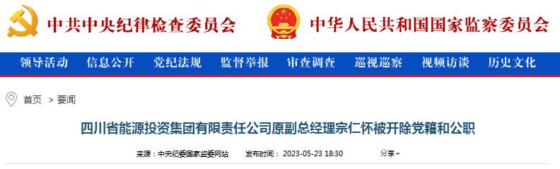 中央紀委國家監(jiān)委網站5月23日消息,據四川省紀委監(jiān)委消息:日前,經四川省委批準,四川省紀委監(jiān)委對四川省能源投資集團有限責任公司原副總經理宗仁懷嚴重違紀違法問題進行了立案審查調查。