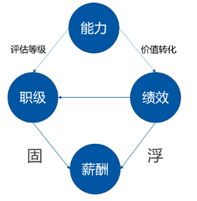能力的評估結(jié)果體現(xiàn)為職級,能力的價值轉(zhuǎn)化體現(xiàn)為績效。我們根據(jù)能力等級定薪,通常體現(xiàn)為固定薪酬和目標(biāo)薪酬;為價值創(chuàng)造付薪,通常體現(xiàn)為浮動薪酬和實際薪酬。這就是我們?nèi)温氋Y格、績效管理、薪酬管理三大體系之間的關(guān)系。