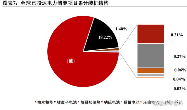 (一)全球儲能裝機規(guī)模持續(xù)增長,鋰電池等電化學儲能規(guī)模突破 抽水蓄能以長壽命、運行成本低以及安全性方面的優(yōu)勢,前期取得了較大規(guī)模的應用。伴隨著新能源配儲等大型儲能電站的應用,鋰電池儲能的規(guī)模隨之獲得了較快的增長。目前,除了抽水儲能外,還沒有一種儲能技術(shù)能同時滿足能量密度高、儲能效率高、壽命長、功率密度大、環(huán)境友好以及成本低等大規(guī)模應用的條件,因此抽水蓄能仍占有舉足輕重的地位。
