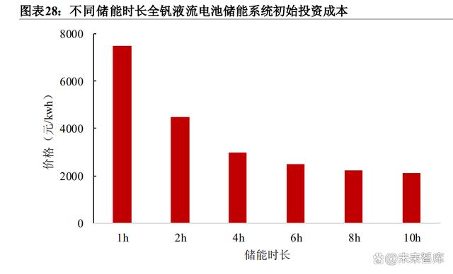 目前,初始投資成本較高是制約全釩液流電池大規(guī)模商業(yè)化應用的最大挑戰(zhàn)。1-10h不同儲能時長的初始投資成本為2100-7500元/kWh。2h左右儲能時長全釩液流電池系統(tǒng)的初始投資約為4500元/kwh,成本約為鋰電池的近2倍。