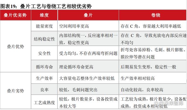 隨著疊片工藝的成熟、國產(chǎn)疊片機效率提升,疊片電池技術(shù)在成本降低的同時效率有望提升。不久的將來,疊片工藝或?qū)⑴c卷繞技術(shù)在更多容量范圍內(nèi)的儲能電池生產(chǎn)形成“相互競爭、相互補充”的態(tài)勢,此前,受限于生產(chǎn)效率低與投入成本高,疊片路線在鋰電池制造環(huán)節(jié)滲透緩慢。隨著疊片設備工藝不斷進步,疊片電池正在快速起量,為供應鏈相關(guān)企業(yè)帶來更大的市場空間,建議關(guān)注國產(chǎn)疊片機、極片沖切模具等技術(shù)設備的相關(guān)廠家。
