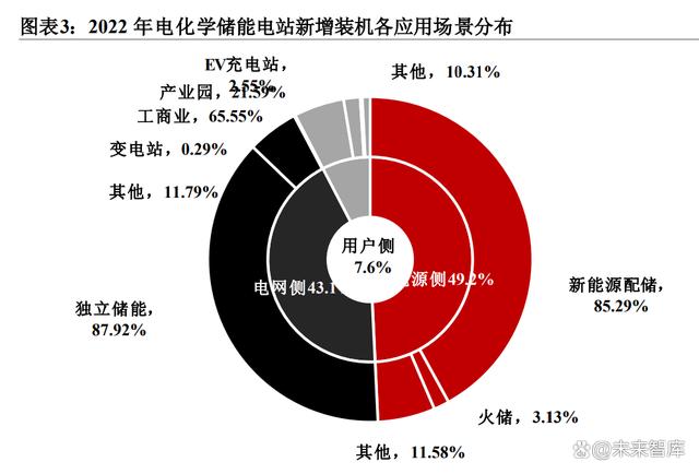 主要場景包括工商業(yè)、產(chǎn)業(yè)園、EV充電站、港口岸電、其他海島/校園/社區(qū)等。儲能裝置在用電低谷時充電,在用電高峰時放電,利用高峰和低谷的電價差,節(jié)省用電費用,從中可獲取經(jīng)濟效益,因此戶用儲能主要集中在高電價及高電價差的國家或地區(qū)。國內(nèi)用戶側(cè)以工商業(yè)儲能(占比65.55%)為主,產(chǎn)業(yè)園儲能、EV充電站的占比也在逐漸提升,在新增裝機中占比21.59%、2.55%。